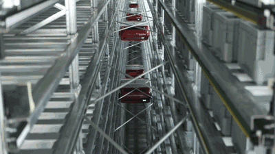 該立庫(kù)的單巷道中同時(shí)設(shè)置多臺(tái)堆垛機(jī),運(yùn)用先進(jìn)的同步協(xié)調(diào)控制技術(shù)使其在各自獨(dú)立的作業(yè)中互不干涉。巷道內(nèi)的堆垛機(jī)為上下兩層結(jié)構(gòu),同時(shí)作業(yè),其入出庫(kù)處理能力可達(dá)2200箱(盒)/小時(shí)。同時(shí)它也是集存儲(chǔ)、輸送、分揀于一體的新型配送系統(tǒng),完全實(shí)現(xiàn)了分揀、集貨等環(huán)節(jié)的自動(dòng)化。其中,分揀系統(tǒng)采用了立體化的三維布局,與以往的平面布局相比,既節(jié)省空間又節(jié)約了人力。