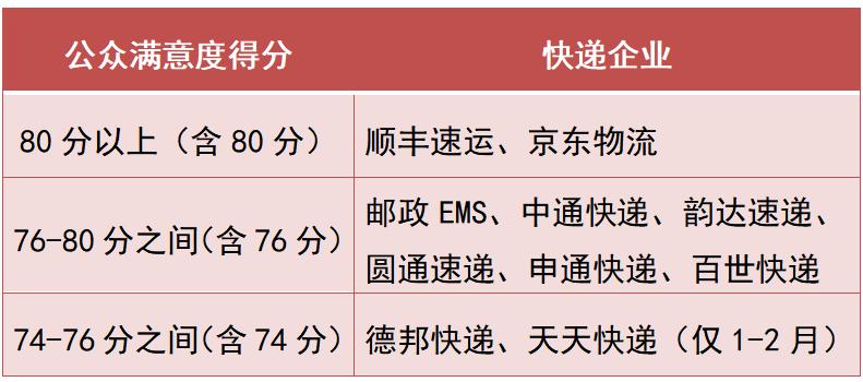 在快遞企業(yè)公眾滿意度方面,得分在80分以上(含80分)的企業(yè)為順豐速運(yùn)、京東物流,得分在76-80分之間(含76分)的企業(yè)為郵政EMS、中通快遞、韻達(dá)速遞、圓通速遞、申通快遞、百世快遞,得分在74-76分之間(含74分)的企業(yè)為德邦快遞、天天快遞(僅1-2月)。