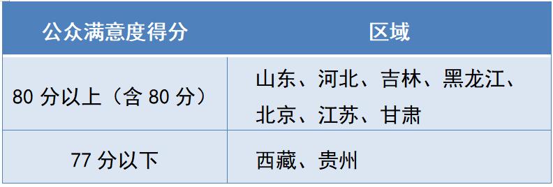 在區(qū)域公眾滿意度得分方面,山東、河北、吉林、黑龍江、北京、江蘇、甘肅得分在80分以上(含80分),表現(xiàn)較好;西藏、貴州得分不滿77分,有進(jìn)一步提升空間。