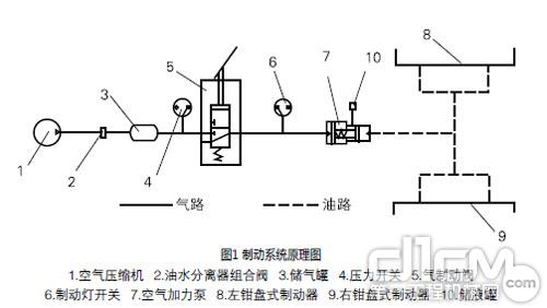 傳統(tǒng)的12t叉車制動系統(tǒng)主要由空氣壓縮機1、油水分離器組合閥2、儲氣罐3、壓力開關(guān)4、氣制動閥5、制動燈開關(guān)6、空氣加力泵7、左鉗盤式制動器8、右鉗盤式制動器9和儲液罐10等組成,如圖1所示。