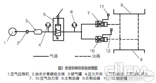 改進措施是在制動系統(tǒng)中各增加1個空氣加力泵及1個儲油罐。改進后,制動系統(tǒng)中共有2個空氣加力泵及2個儲液罐,即空氣加力泵7、10和儲液罐11、12,如圖2所示。