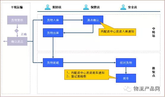 五是中轉(zhuǎn)入庫確認(rèn):中轉(zhuǎn)貨物卸載確認(rèn)后,由中轉(zhuǎn)站保管員對入庫貨物進(jìn)行確認(rèn);記錄入庫時間。