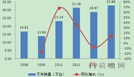 根據(jù)《2014-2018年中國叉車制造行業(yè)產(chǎn)銷需求預測與轉(zhuǎn)型升級分析報告》數(shù)據(jù)顯示,2013年中國工業(yè)車輛迎來較為強勁的發(fā)展態(tài)勢,2013年國內(nèi)機動工業(yè)車輛制造企業(yè)五類叉車(機動工業(yè)車輛)銷售量累計達到了328764臺,較2012年的288662臺上升了13.89%。