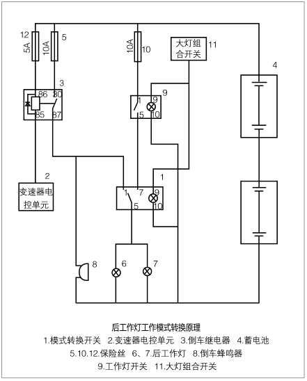 該叉車后工作燈控制原理如附圖所示,其主要由模式轉換開關1、變速器電控單元2、倒車繼電器3、蓄電池4、保險絲(5、10、12)、后工作燈(6、7)、倒車蜂鳴器8、工作燈開關9、大燈組合開關11等組成。其工作過程如下:
