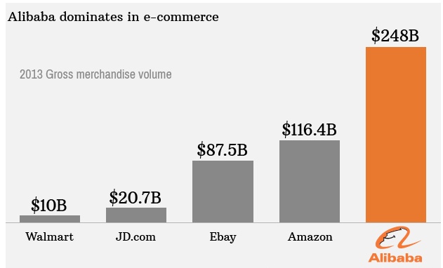 3、阿里巴巴擁有全球最大的電子商務(wù)交易平臺,涵蓋零售與批發(fā)貿(mào)易兩大領(lǐng)域。去年,電子商務(wù)總交易額約2480億美元,遠(yuǎn)超沃爾瑪、易貝、亞馬遜。