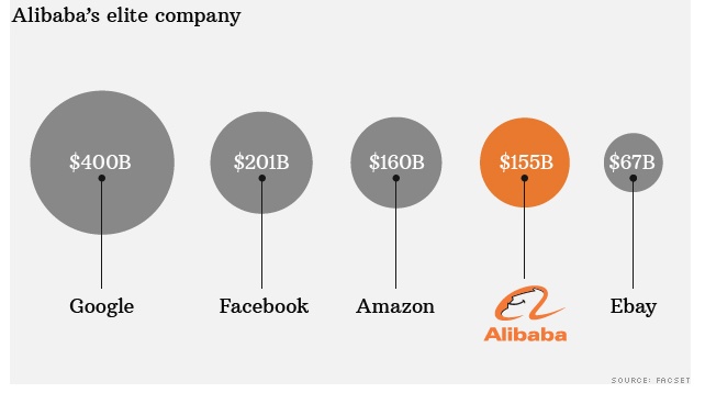 2、阿里巴巴已經(jīng)公布了IPO發(fā)行價區(qū)間為每股美國存托股60美元至66美元,若按中間值計算,為公司估值1550億美元。僅次于谷歌、臉譜、亞馬遜,超過了易貝。阿里巴巴啟動路演,阿里巴巴為路演組建了兩支由銀行家和高管組成的團(tuán)隊,并以公司Logo顏色命名。兩支團(tuán)隊中都包含了承銷商公司的代表。這些承銷商包括高盛、摩根士丹利、花旗集團(tuán)和羅斯柴爾德銀行等,在紐約路演結(jié)束后,阿里巴巴還將赴美國其他城市繼續(xù)路演,包括波士頓、巴爾的摩、丹佛、舊金山和洛杉磯。美國路演結(jié)束后,阿里巴巴將移師香港、新加坡和倫敦,而部分代表還可能造訪中東。阿里巴巴IPO路演預(yù)計將于9月18日結(jié)束。如果順利完成,則阿里巴巴將于9月18日晚確定IPO發(fā)行價,9月19日正式掛牌交易。阿里巴巴股票將在紐交所上市。