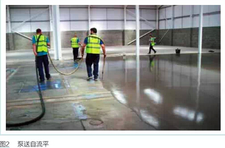 專業(yè)團隊進行水泥基泵送自流平施工相當簡便,如圖2。在勘測地坪表面后,首先需要磨平突出處并填補低洼處。繼而進行表面處理以提供整潔的粘結(jié)面,鋪設恰當?shù)牡灼峥稍黾诱尺B性。然后運用泵送設備完成最薄7mm砂漿層。最后,在凝固后的表面鋪設滲透涂封劑、表面密封劑或環(huán)氧涂層,形成高平整度高耐磨的地坪。