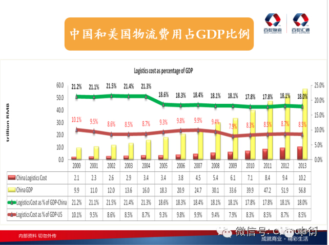 至于做物流,很多圖我們是畫了很久的,下面幾張圖是2007年九月份畫的,沒有改,因?yàn)槲覀冏鋈魏问虑橐私鉃槭裁匆鲞@件事,怎么樣來做?這張圖大家很清楚,很簡單的一張圖,只是想說明幾個(gè)例子。第一,中國的物流占整個(gè)GDP的值,大家知道費(fèi)用很高,我們把每個(gè)季度都看了。在美國這大概是統(tǒng)計(jì)到2013年,百分之八點(diǎn)幾,在歐洲大概是百分之十左右,在日本大概是百分之十一左右。一直下不來?,F(xiàn)在看一下美國。美國70年代末,80年代初的時(shí)候,很多物流也占了GDP的百分之十七或十八,也是那么高,經(jīng)過20年、30年以后,2012年,現(xiàn)在剛剛看才的圖,也就是百分之八點(diǎn)幾。所以說中國現(xiàn)在的實(shí)際情況跟美國80年代初是差不多的,藍(lán)色的是倉儲(chǔ)管理,占了百分之四十幾。運(yùn)輸占了50%左右,3%~5%是技術(shù)和設(shè)備等造成的。