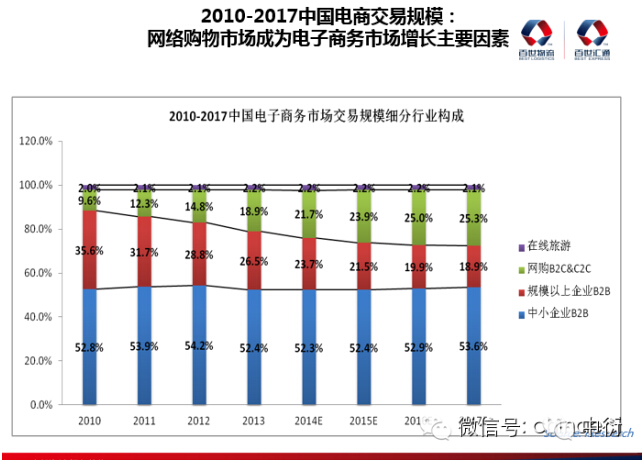 第二塊綠色部分漲得比較快是網(wǎng)購,B2B、C2C,第三塊是中小企業(yè)的B2B。大家知道網(wǎng)購是以快遞為基礎(chǔ)做運(yùn)輸合倉儲(chǔ)管理。但是中小B2B的企業(yè),我覺得是快運(yùn)的市場(chǎng),因?yàn)樘貏e是中小型的B2B基本上是最快的市場(chǎng),發(fā)生很快,所以我看今天也有很多的一些同行和朋友在這里。