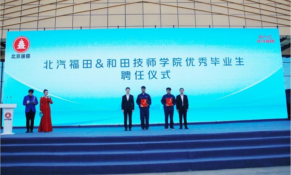 新疆交通產(chǎn)業(yè)的發(fā)展離不開專業(yè)人才的支撐。為激勵(lì)和田技工人才的學(xué)習(xí)熱情,北汽福田正式聘用和田技師學(xué)院30名優(yōu)秀畢業(yè)生成為北汽福田經(jīng)銷商員工,以行動(dòng)發(fā)揚(yáng)國企擔(dān)當(dāng),北汽福田副總經(jīng)理、新聞發(fā)言人鞏海東為2名優(yōu)秀畢業(yè)代表生頒發(fā)聘書。