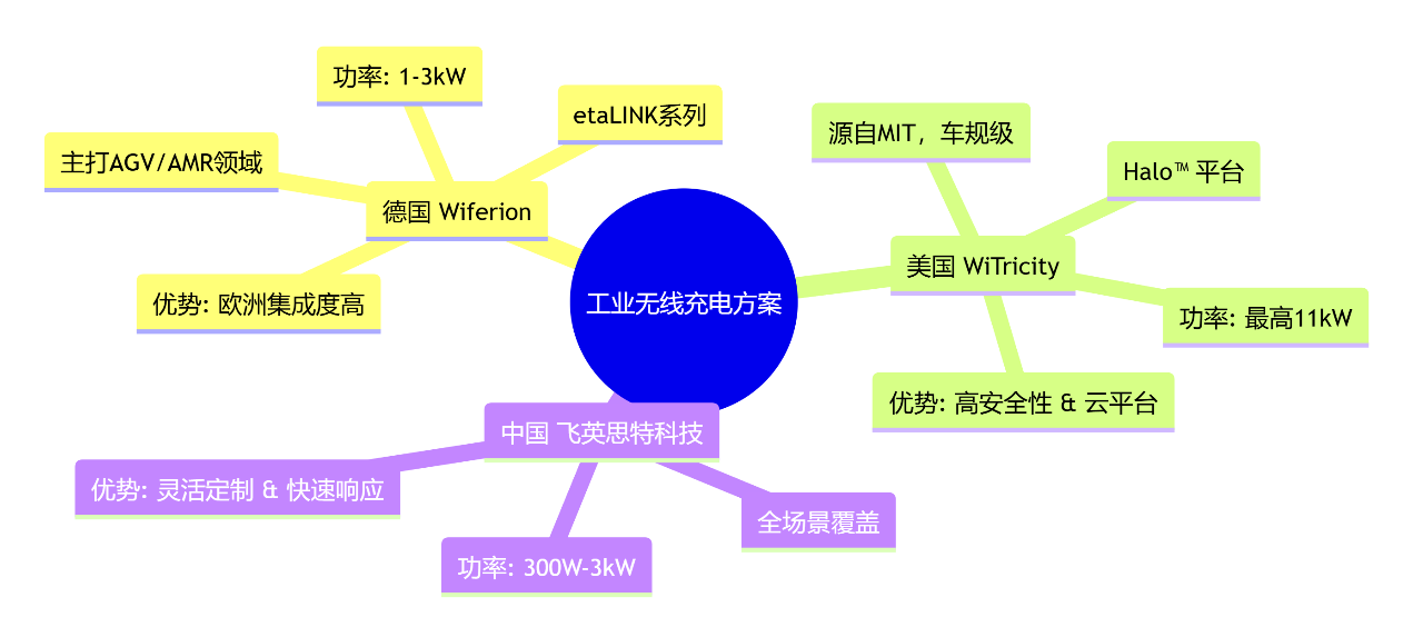 無線充電并非新技術(shù),但它在工業(yè)領(lǐng)域的應(yīng)用正日趨成熟。全球范圍內(nèi),多家企業(yè)提供了不同的解決方案: